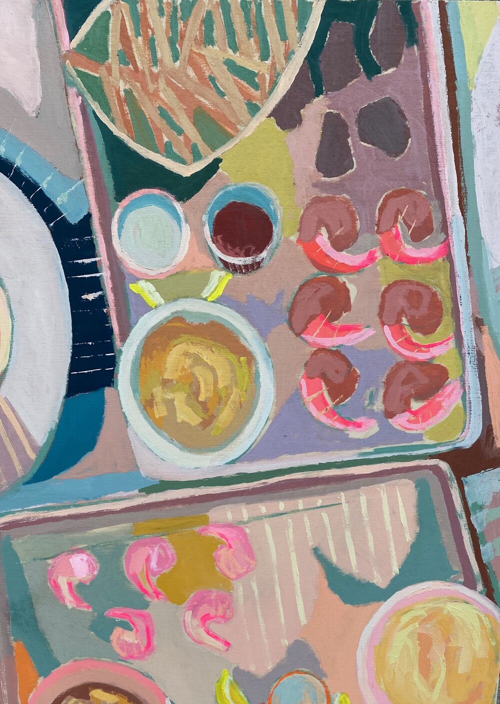 She has mastered the still life tablescape in a fun colorful way among other genres including happy portraits.