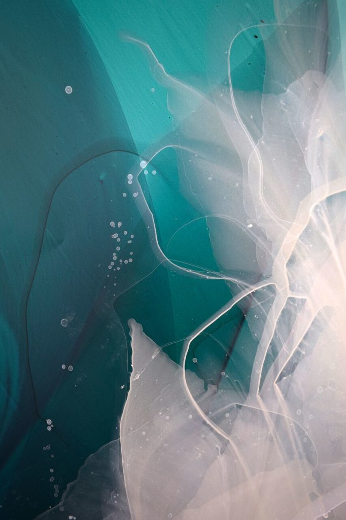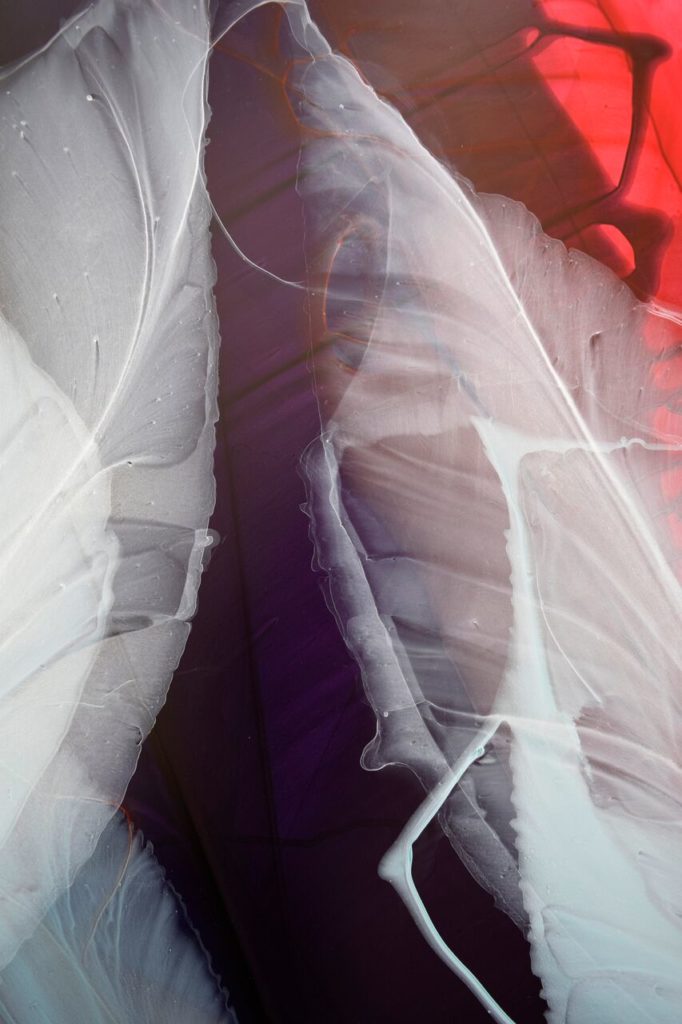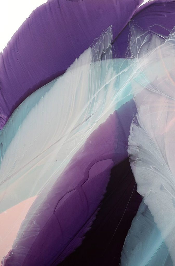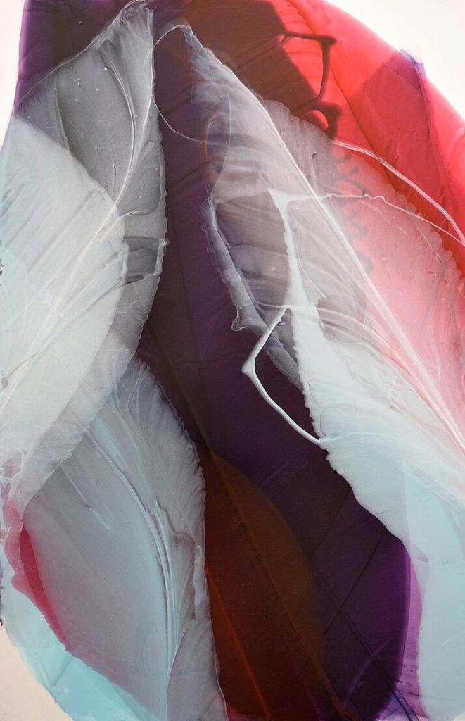 My relationship with the medium is very physical. The surface of a painting is bent, manipulated and twisted to guide the paint, granting the process a sculptural quality. Through simple gestures of pouring and removing paint, gravity shapes the lines and forms that start to resemble organic elements. Each painting seeks a level of reservation as well as an embrace of spontaneity.”