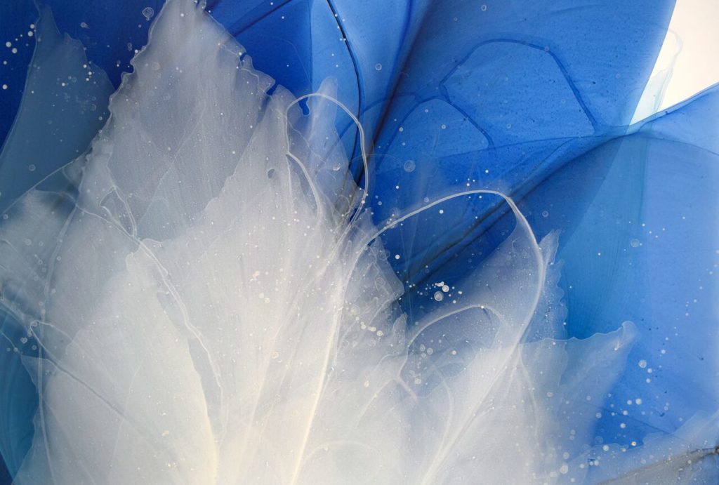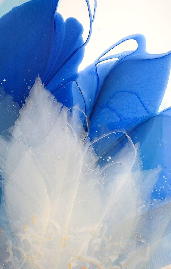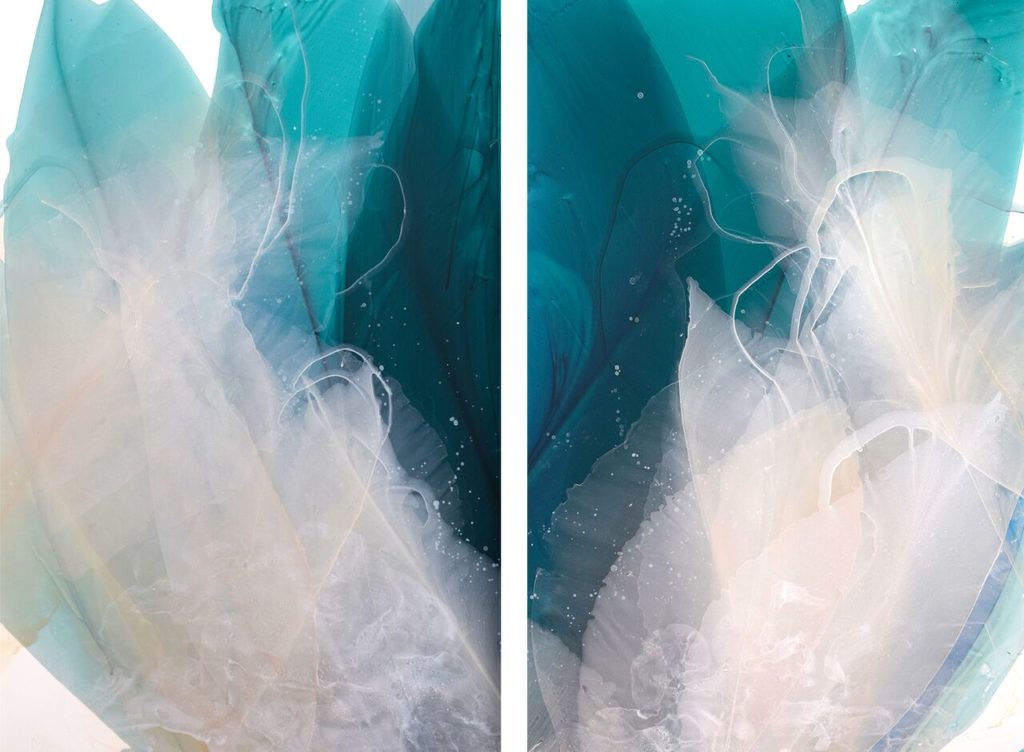 “My paintings are nature based abstractions driven by an exploration of movement, color, harmony and balance. Watercolor lends itself to the build up of layers, capturing traces of time and transformation. I am inspired by the aesthetics of floral x-ray photography, developed by a radiologist in the 1930’s, this documentation of plant forms resulted in a poetic merge of art and science. The minimal and reductive photographs conveyed an intrinsic beauty. Taking from their simplicity, I approach my paintings with a sense of restraint; laying down transparent shapes of color and letting the interaction of hues establish a feeling of depth and dynamic motion within each piece.
