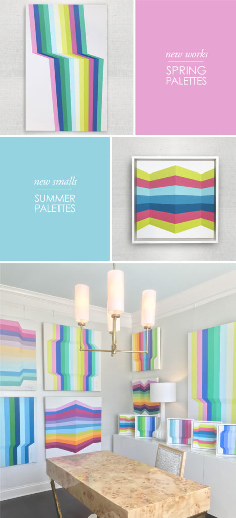 “This season I took the opportunity to dive into some of my favorite spring colors, and I have everything from small framed 12″x12″ pieces all the way to large 48″x48″ works. I’ve loved working on each and every piece, and my hope is that they’ll bring some of that happiness to each of their new homes!”
