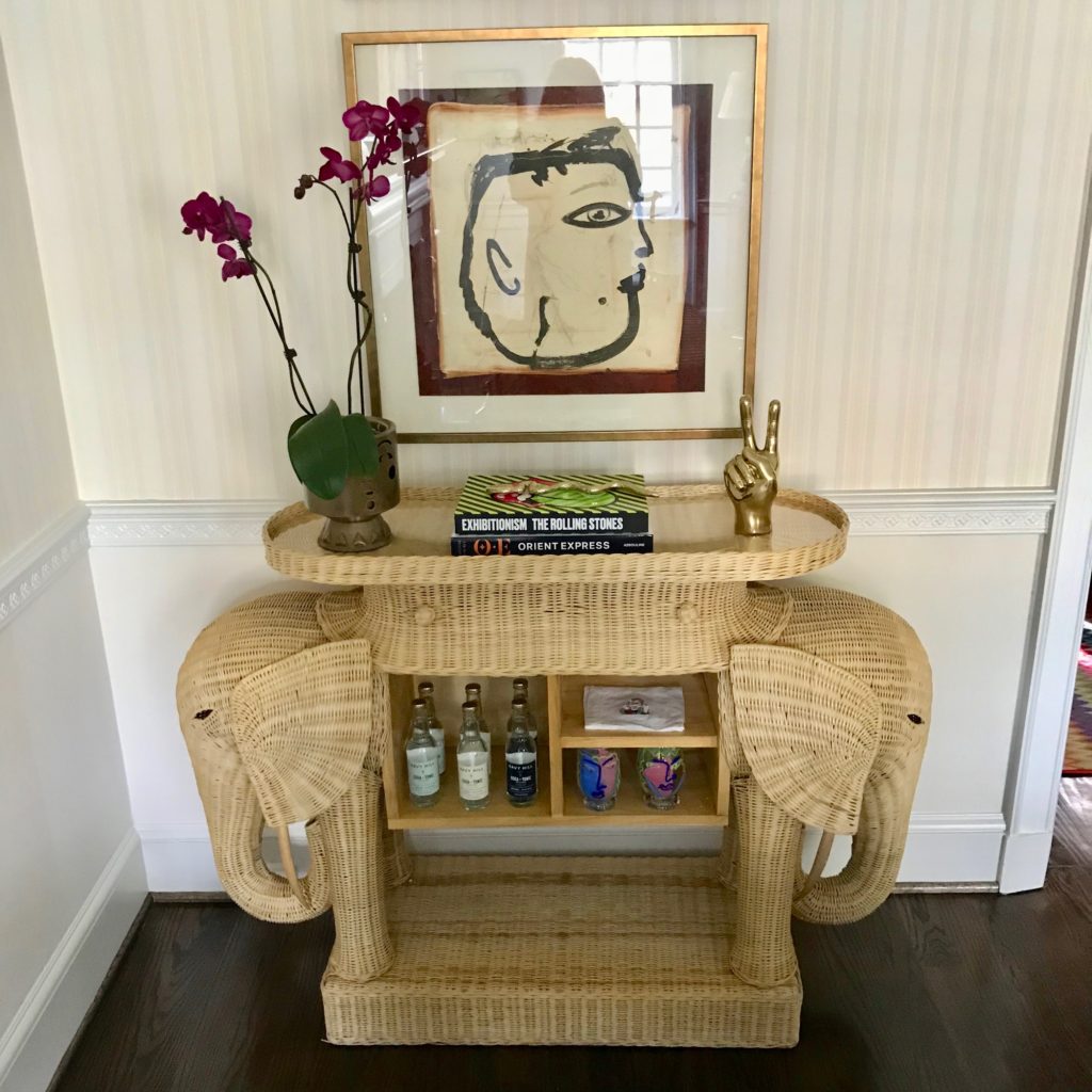 IRIS APFEL RATTAN ELEPHANT CONSOLE TABLE – “I buy what makes me happy,” says interior designer and fashion icon Iris Apfel, and our Iris Apfel Rattan Elephant Console Table from our exclusive Iris Apfel capsule collection is ready for your happy hour. Expertly handwoven, it was inspired by vintage Italian mid-century designs which had been inspired by Indian art and culture, where elephant symbolism has had a long history. Hidden shelving in the side to hold smaller items. The wicker tabletop has an acrylic overlay, keeping glasses and delicate items in place. Use the base as a shelf, too.