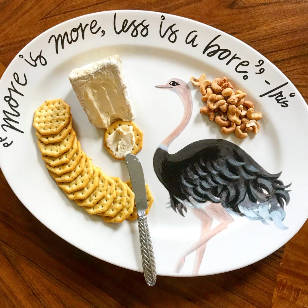 IRIS APFEL OSTRICH SERVING PLATTER – “Anything feathery-looking, I love,” said interior designer and style icon Iris Apfel, and we can see why when we see this elegantly whimsical 100% earthenware Iris Apfel Ostrich Serving Platter, a grandinroad exclusive design for our Iris Apfel capsule collection. The playful illustration of a ready-to-party ostrich is updated with another Iris quote: “More is more, less is a bore.” We love this instant party centerpiece. Your guests will too.