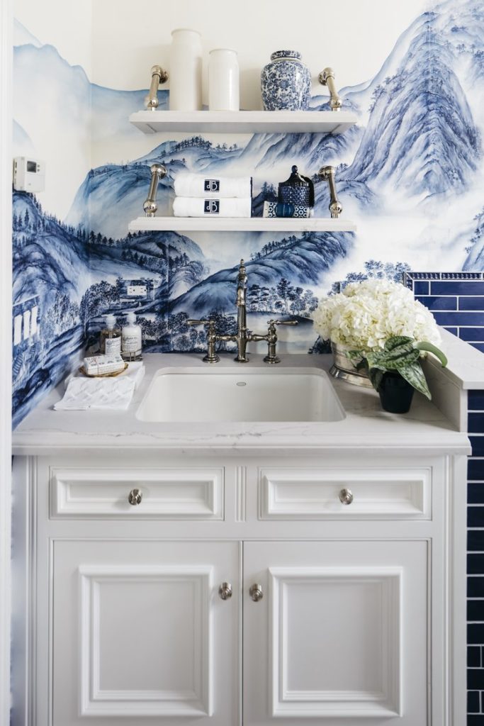 There is EVERY reason why precious garments deserve to be refreshed in palatial surroundings. This laundry room evokes “loads” of luxe while still maintaining necessary function. Never again will laundry be seen asa chore. Included in this utility space—hand-painted de Gournay wallpaper, Clive Christian custom cabinetry, a doggy wash for the pampered pooch of the house, wicker hampers, and decorative open shelves designed with custom French bistro brackets.