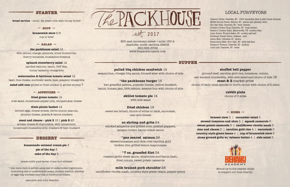 Dying to try this new Charlotte restaurant, The Packhouse. Check out this menu!