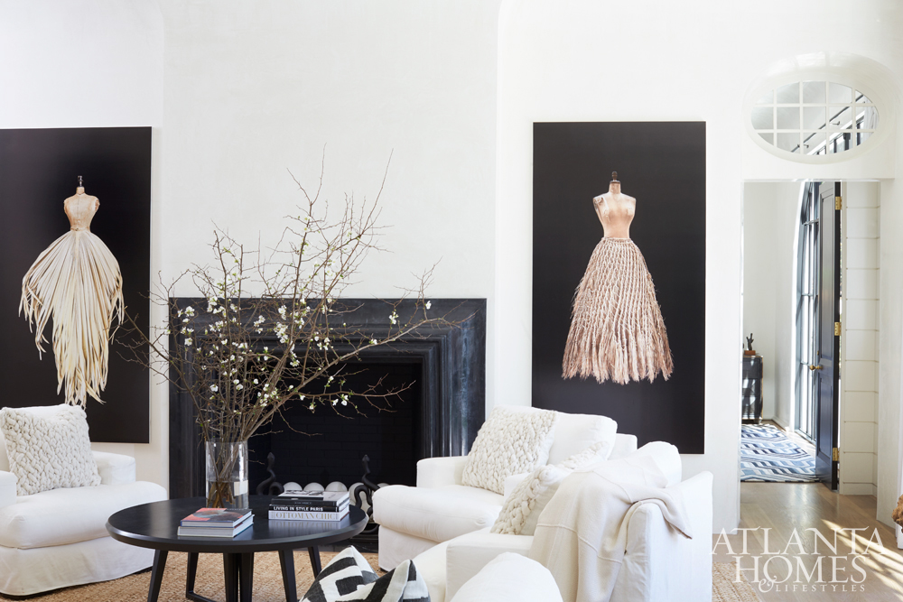 A pair of large-scale paintings by Atlanta artist Todd Murphy presides over the fireplace and adds an element of movement to this serene corner of the living room.