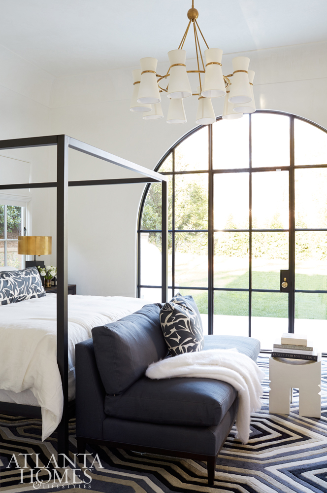 The black-and-white scheme continues in the master bedroom via a custom rug through SOURCE and a sofa from Lee Industries. Bed, Room & Board. Chandelier, Circa.