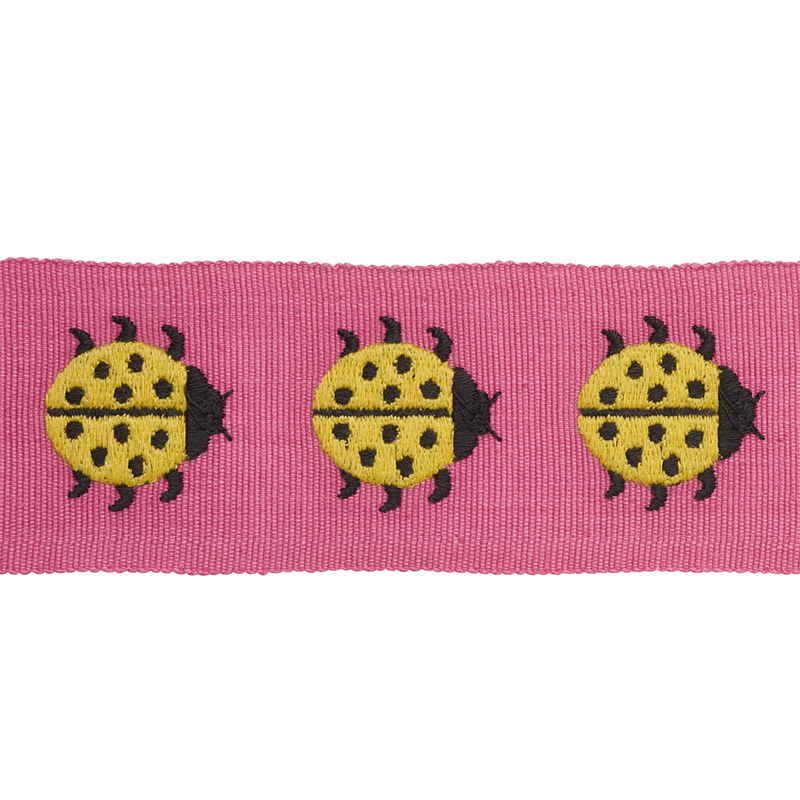 Embroidered ladybugs march along a woven cotton tape for a sunny and happy accessory that’s the height of preppy chic.