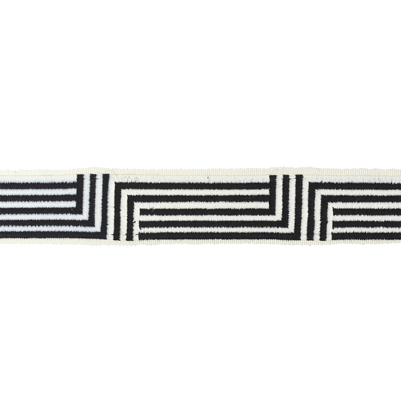 This versatile, Art Deco-like geometric tape boasts embroidered rows of satin stitching for a gleaming, graphic flourish.