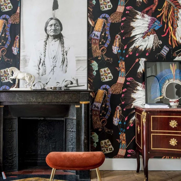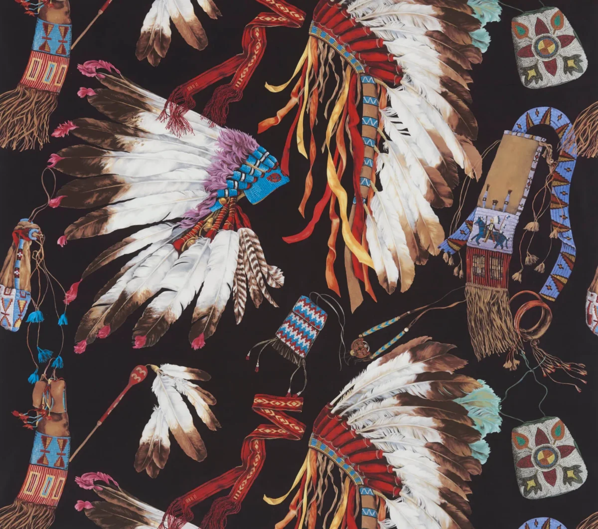 This print on cotton reproduces a hand-drawn design. It is a veritable tribute to the opulent and majestic headdresses of Native American tribal chiefs. Each feather or jewelry ornament has a special significance: creative force, courage, honor or pride. With this design, Pierre Frey expresses its enthusiasm for the artisanal know-how of these tribes.
