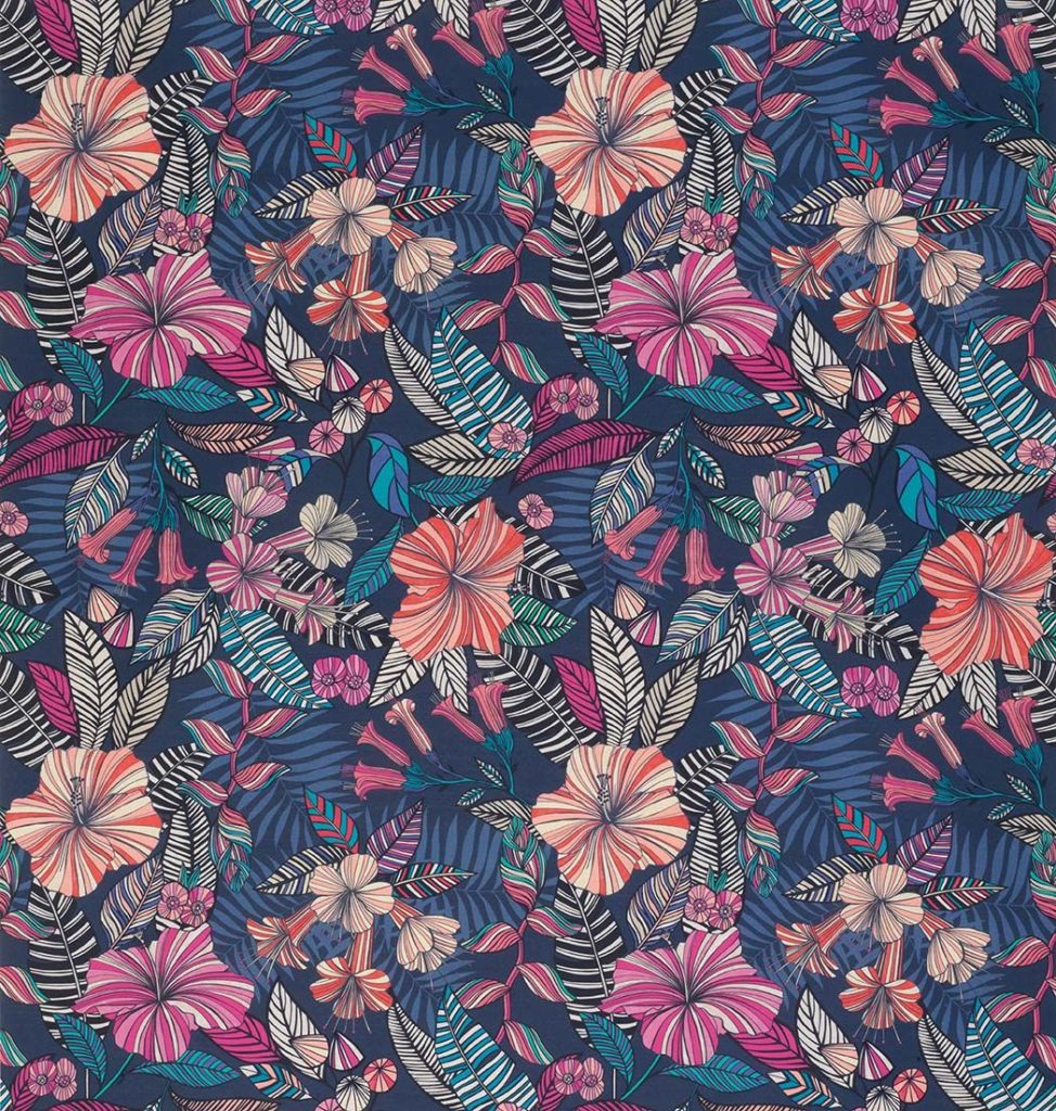 An all over stylised composition of colourful flowers and contrasting striped leaves printed on linen union. Named after one of the most beautiful villages on the island of Mallorca.