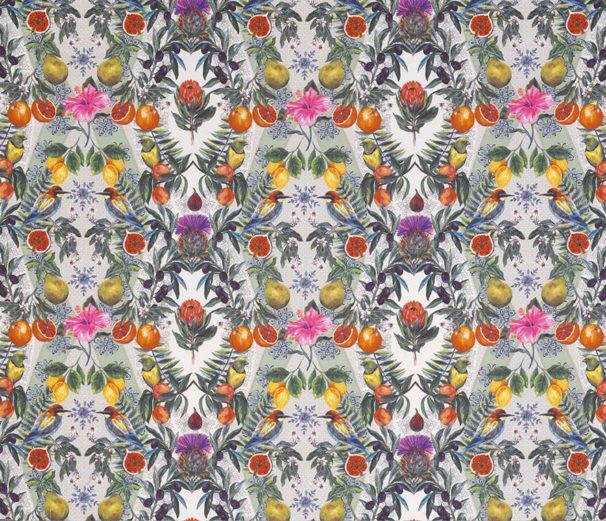 A colourful trellis of ribbons combined with citrus fruits and vivid hedgerow flowers is printed on pure cotton. Named after Talavera de la Reina in Castile in mainland Spain, a city famed for its ceramics.