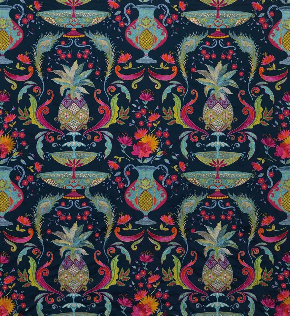 Ornamental fountains and flower-filled vases bedecked with richly detailed pineapple and peacock feather motifs. Embroidery on contrasting cotton satin ground.