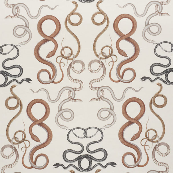 Check out this serpent beauty from F.Schumacher with its cascade of hand-drawn, intertwining snakes, Giove invokes one of the oldest mythological symbols. This beguiling pattern is also available as a wallpaper.