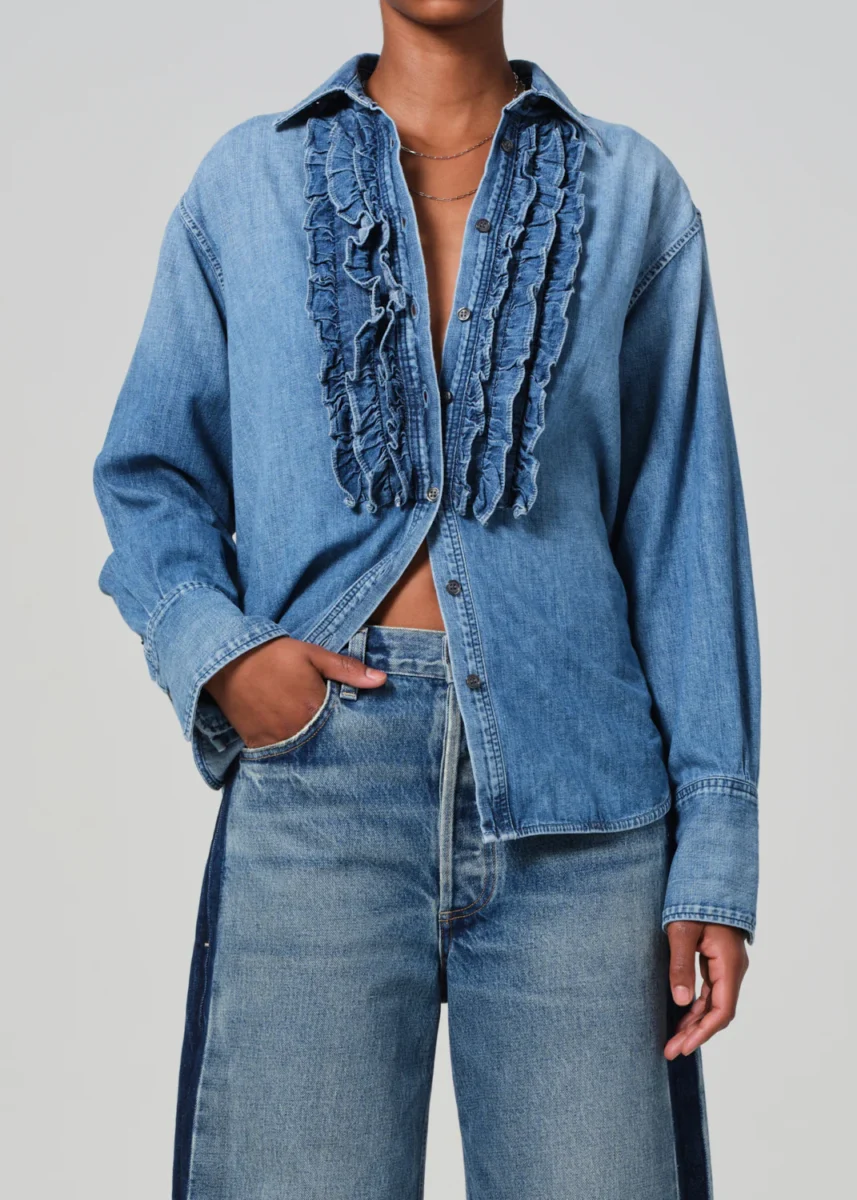 I would dress this Denim Ruffle Tuxedo Shirt with sequins or lame for holiday and jeans for casual.
