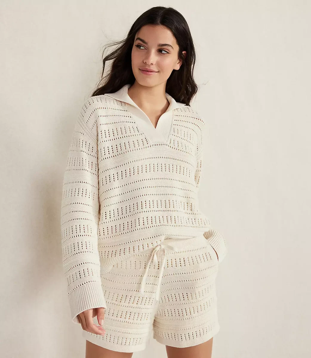 Summer chill outfit of Haven Well Within Organic Cotton Open Stitch Johnny Collar Sweater and Haven Well Within Organic Cotton Open Stitch Shorts