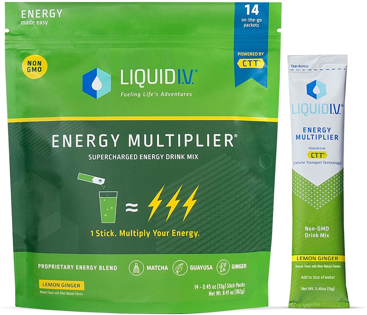 Liquid I.V. Energy Multiplier | Energy Powder Drink Sticks | Matcha and Green Energy Blend Drink Mix | Natural Caffeine | Easy Open Single-Serving Stick | Non-GMO | Lemon Ginger comes with rave reviews for a friend.