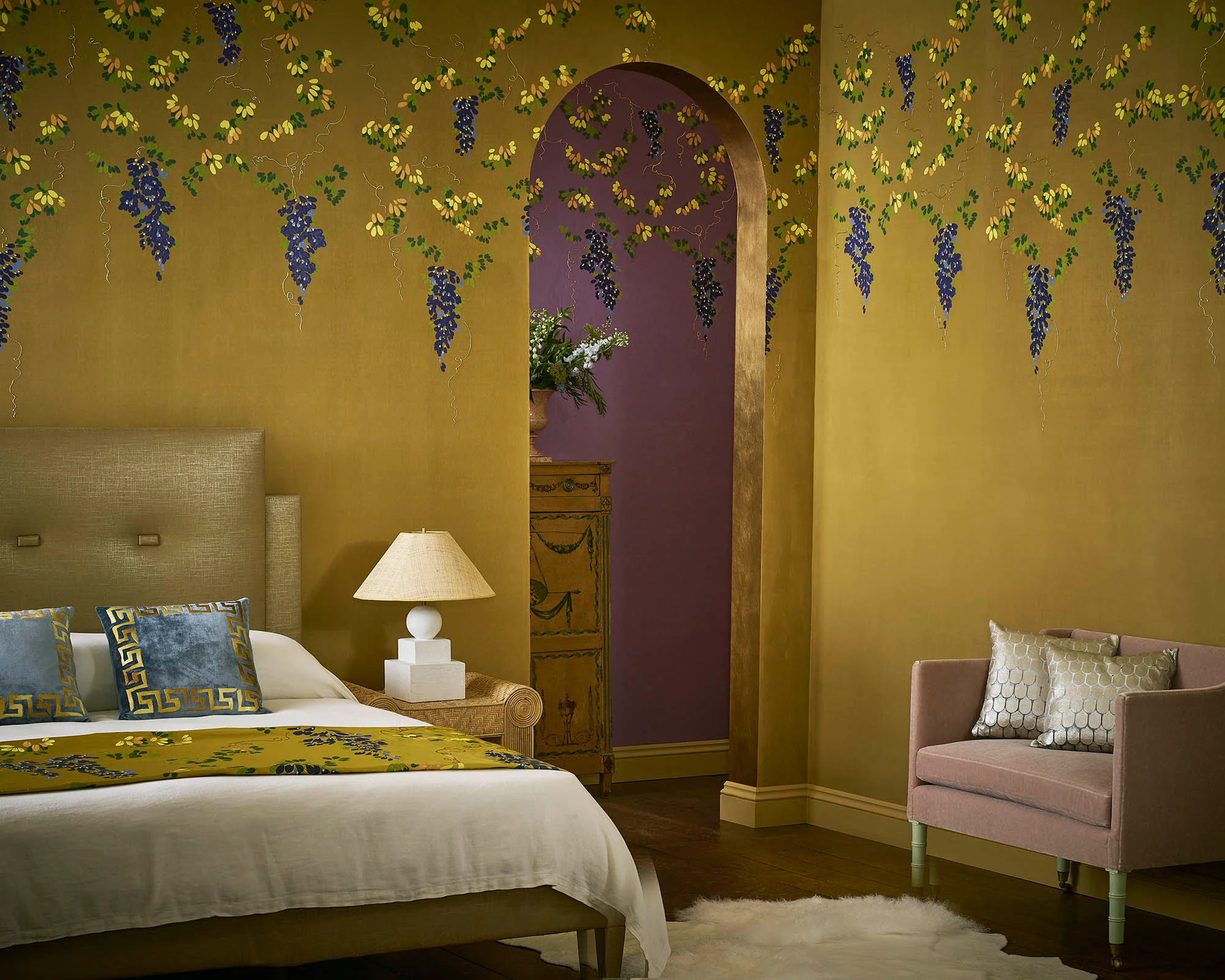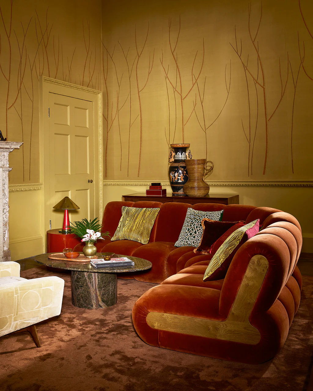 This debut interiors collection features eight unapologetically maximalist designs layered with hand-painted and embroidered silks, bruised velvets, and gilded finishes that feel wildly decadent yet deeply artistic. It’s theatrical. It’s romantic. It’s a little rebellious in the best way.