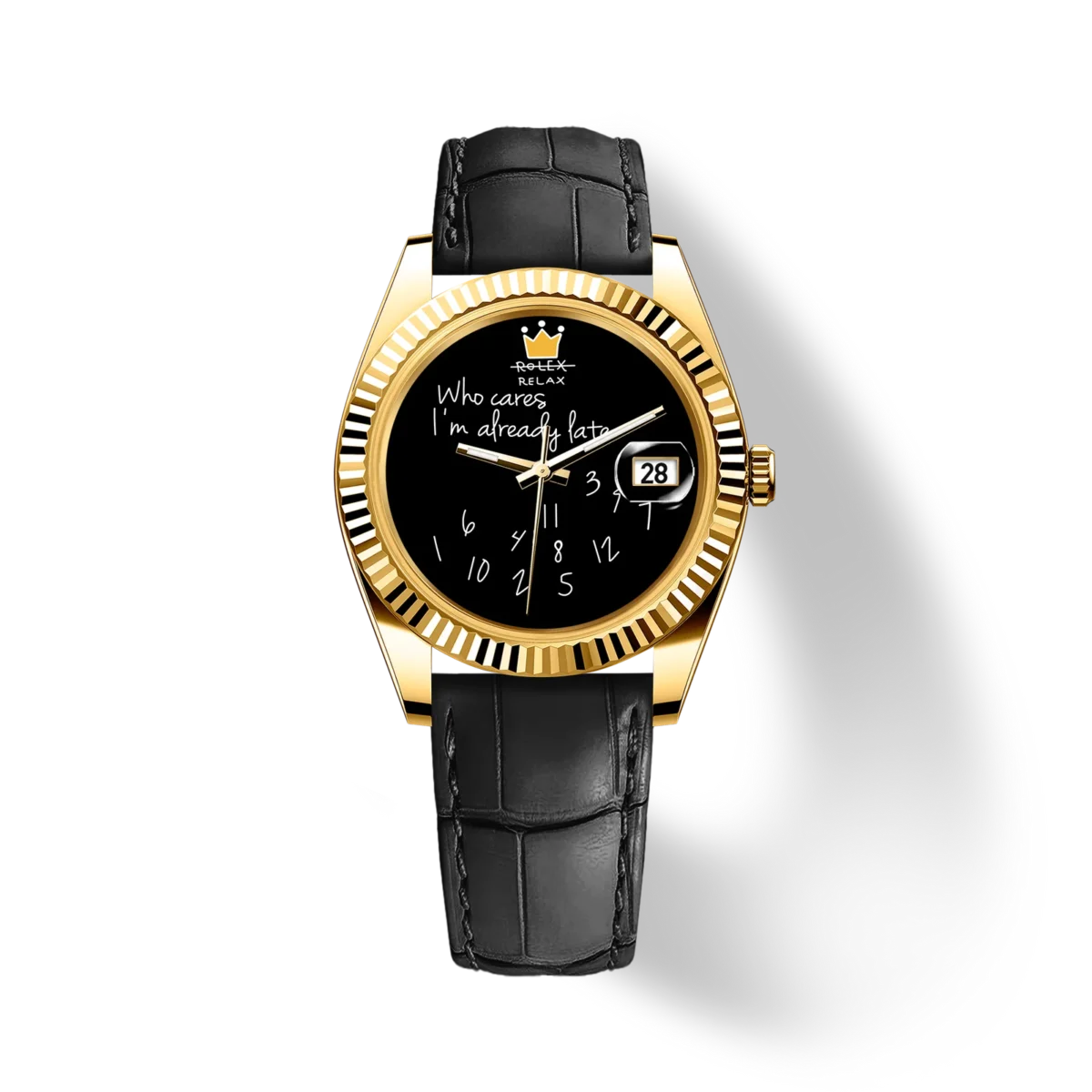 This all started when my nephew sent me a watch link and said, “This made me think of you.” At first glance, it looks like a classic Rolex—but instead it says RELAX. The numbers are scattered, the time is completely jumbled, and written right across the face: “Who cares, I’m already late.”