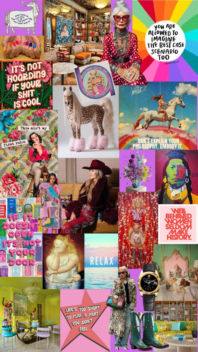 It’s women who don’t behave, rooms that don’t apologize, horses that defy gravity, boots that don’t wait for permission, and reminders that if it doesn’t open… it’s not your door. It’s Iris-level confidence, cowgirl courage, humor as armor, and color as therapy. It’s about embodying your philosophy instead of explaining it.